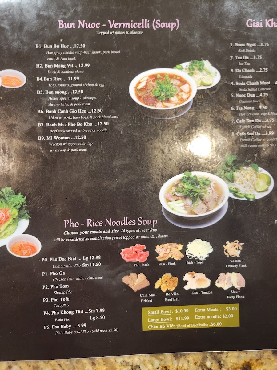 Large Combination meats steak, brisket, flank, beef balls, tripe, Tendon, fatty flank, and crunchy flank pho. serve with fresh bean sprouts fresh basil, lemon, and jalapenos.